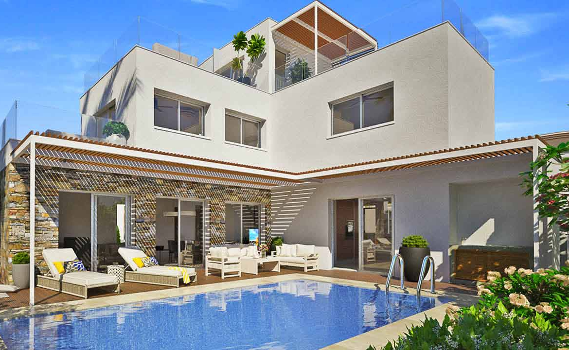 Aquamarine Coastal Villas, Villa No. 11 is a modern design 4 bedroom villa for sale, located in the heart of the tourist area of Paphos in Cyprus. The villa is designed in a large plot and enjoys a private swimming pool with spacious outdoor areas. The villa is located in front of one of the most famous sandy beaches in Paphos and enjoys easy access to a variety of restaurants, pubs, bars 5-star beach resorts and other amenities.